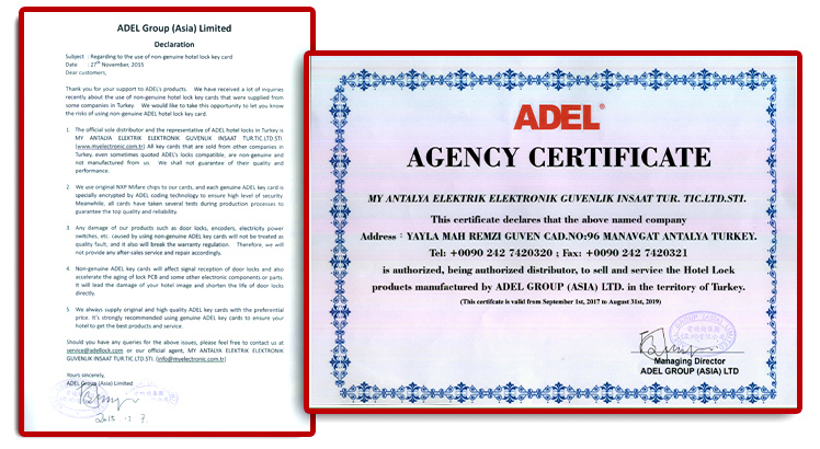ADEL Yetkili Distribütörü sertifikası.